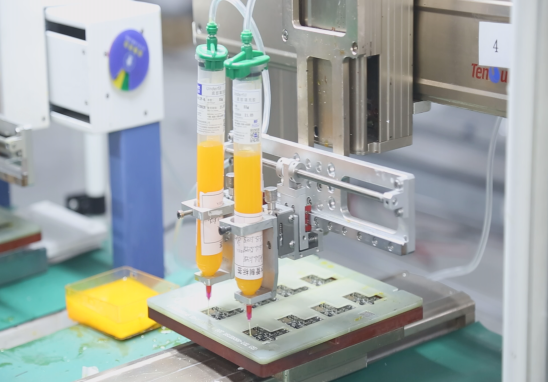 公司自主研制Underfill 底部填充封裝材料,品質媲美國際先進水平,具有粘接強度高,適用材料廣,黏度低、固化快、流動性高、返修性能佳等諸多優點,已被廣泛應用于新能源汽車、智能終端、消費類電子的手機藍牙模塊芯片與智能穿戴芯片填充、指紋識別模組與攝像模組芯片封裝、鋰電池保護板芯片封裝等生產環節上,可有效起到加固、防跌落等作用。
