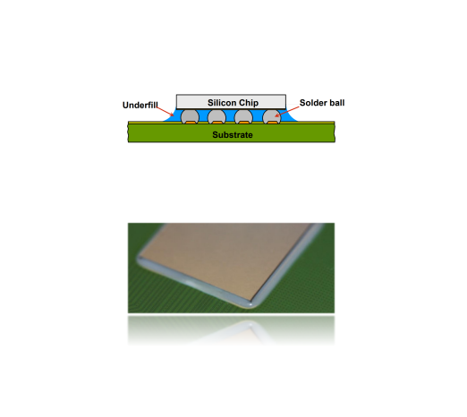 Underfill工藝是一種集成電路封裝工藝,用于在倒裝芯片邊緣點(diǎn)涂環(huán)氧樹脂膠水,通過“毛細(xì)管效應(yīng)”完成底部填充過程,并在加熱情況下使膠水固化。該工藝在緩解芯片封裝中不同材料之間熱膨脹系數(shù)不匹配帶來的應(yīng)力集中問題,提高器件封裝可靠性方面起著重要作用。